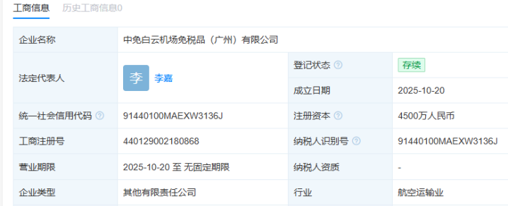 天眼查工商信息显示,10月20日,中免白云机场免税品(广州)有限公司成立炒股配资网站来,法定代表人为李嘉,注册资本4500万人民币,经营范围包括食品销售、互联网销售、化妆品零售、电子产品销售等。